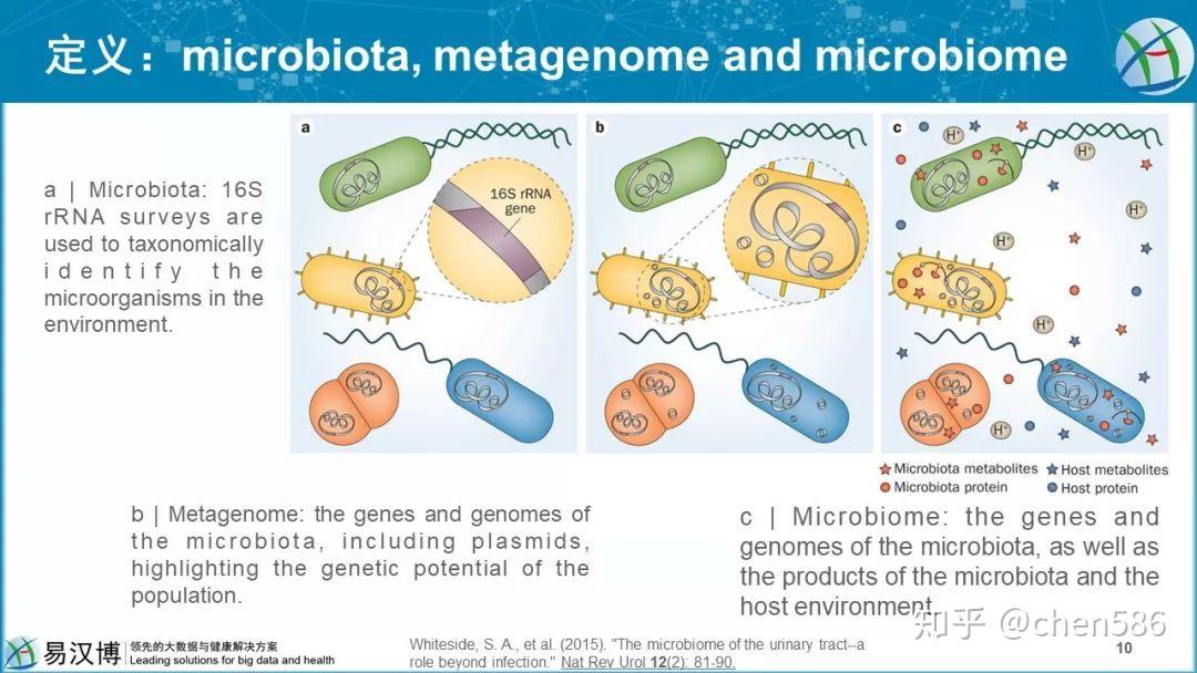每张图代表的是相同的群体,然而不同的方法可以定义此群体可提供的不同信息。- a. 微生物群:采用16SrRNA研究方法鉴定此环境中微生物的种类。- b. 宏基因组:微生物群的基因和基因组,包括质粒、强调群体的遗传学潜能。- c. 微生物组:微生物群的基因和基因组,以及微生物群的产物与宿主环境。