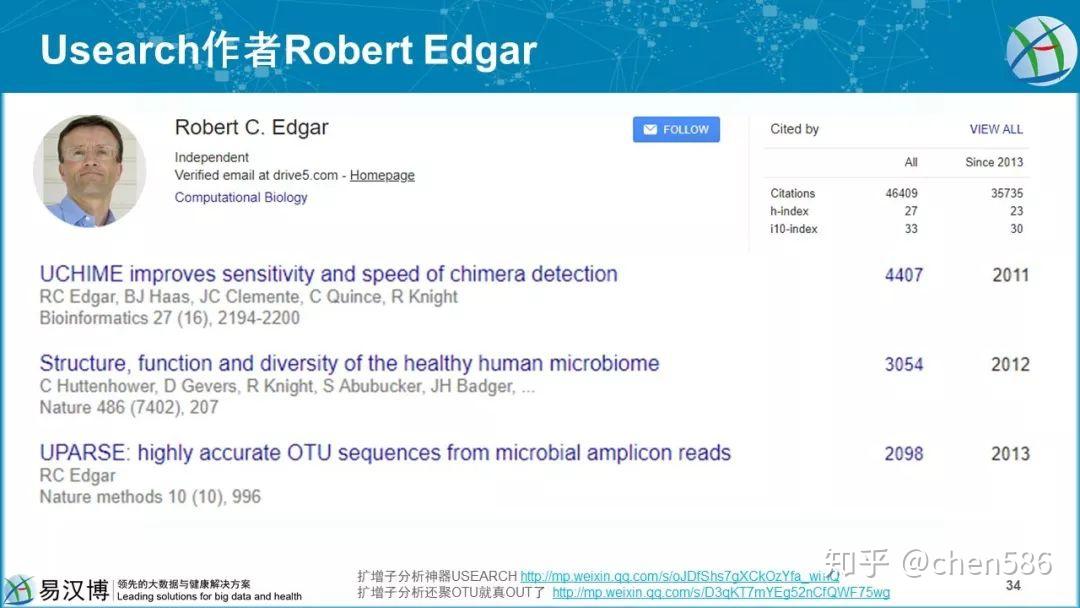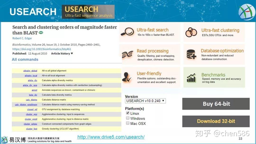 Usearch,有代表的核心算法。UCHIME和UPARSE,引用6500+,加上usearch 6500,有1.3万次。QIIME和Muthur都推荐使用UPARSE聚类。