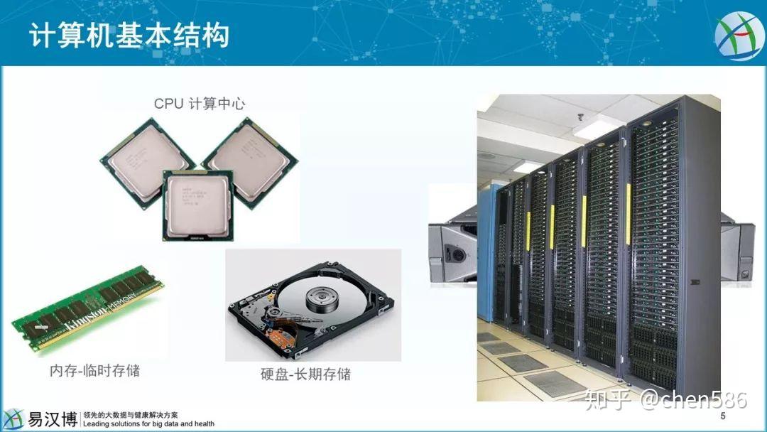 计算机是模拟人脑进行简单重复劳动的过程。数据存储于硬盘,读入内存用于CPU高速计算,结果再返回硬盘保存。服务器和台式机差不多,只是配置高一点,再就是多。