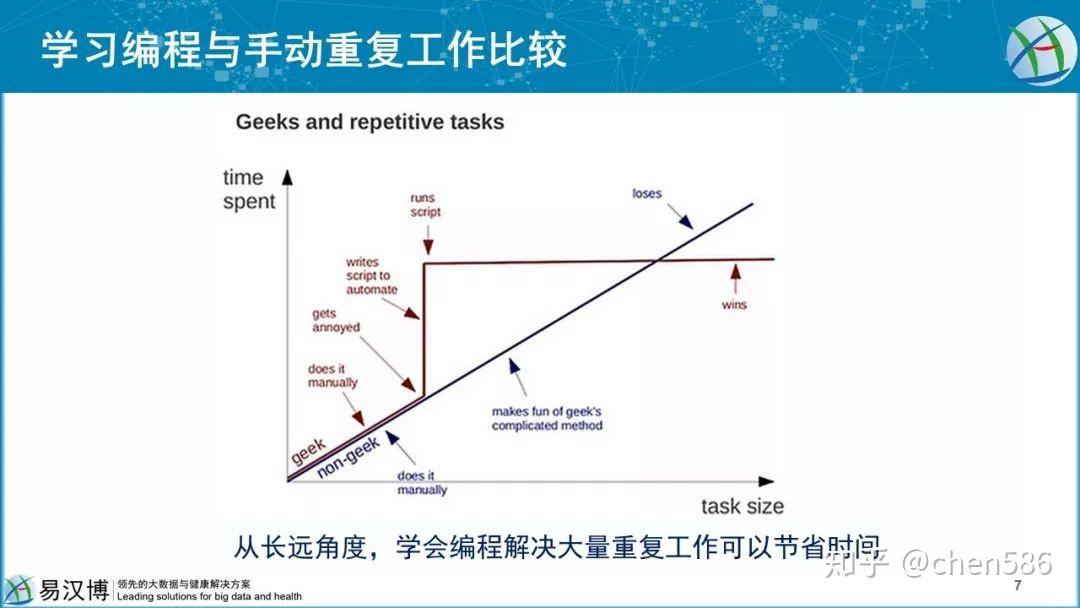 举个例子,你有一千份Excel表,主要工作是计算表格每行均值,再按结果降序排列,筛选出前3均值最高的候选。Excel中操作量与时间成正比的,编程批量操作分三个阶段:1. 手动操作几十份找规律;2. 停下工作编写程序并测试;3. 运行程序完成工作。(单位的文员最需要学编程,但他们会编程就叫数据工程师/科学家)