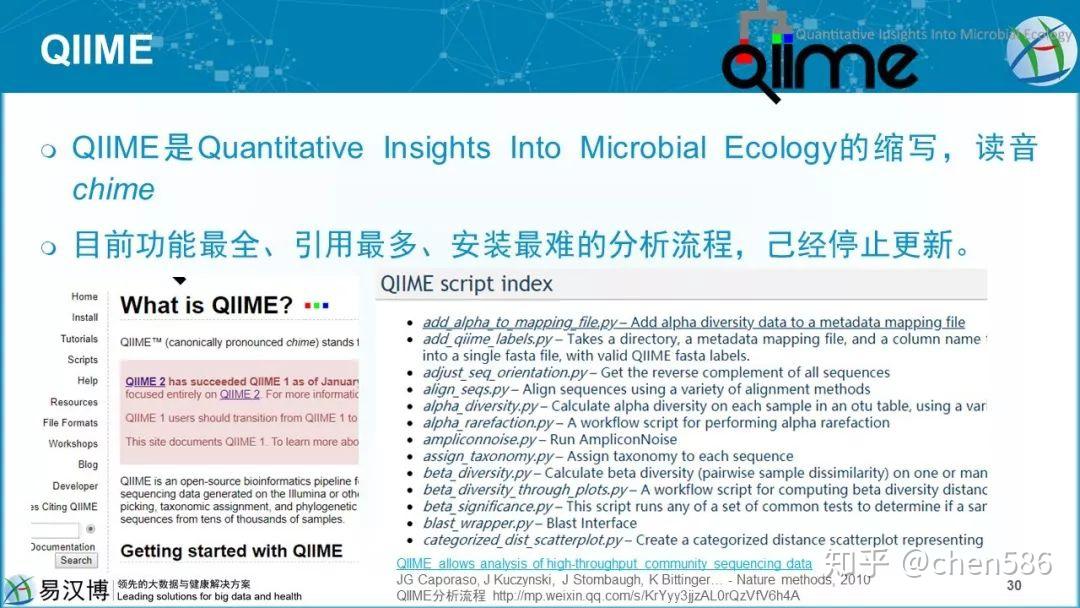 定量分析微生物生态;去复杂化、质控、OUT鉴定、物种分类、进化关系重建、多样性分析及可视化;它把这个领域打通了,整理了200多个软件和包,编写了150+脚本,几乎可以做本领域的任何分析。内容太多,学习成本太高,新用户无从选择。