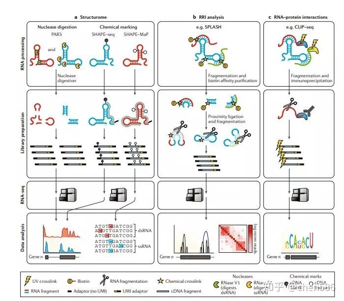 核糖体RNA和tRNA构成细胞的大部分RNA。它们与其他有特定结构的非编码RNA一起在基因调控到翻译的多种细胞过程发挥作用。用于解析RNA结构的方法主要有两种,分别是基于核酶的方法和化学探针法。核糖核酸酶消化法于1965年首次用于确定(tRNA-Ala)RNA结构。在随后的40年中开发了化学方法,例如基于引物延伸化学分析进行选择性2′-羟基乙酰化法(SHAPE),可以在碱基对分辨率下确定tRNA-Asp的结构。但是,只有将各种核酶法和化学法与RNA-seq结合使用,才能进行全转录组范围而非单个RNA水平的结构分析,这会加深我们关于RNA对结构组复杂性和重要性的理解。在这里,我们着眼于核酶法和化学探针法之间的主要差异(图6a)。请阅读Strobedl的综述做更全面的了解。