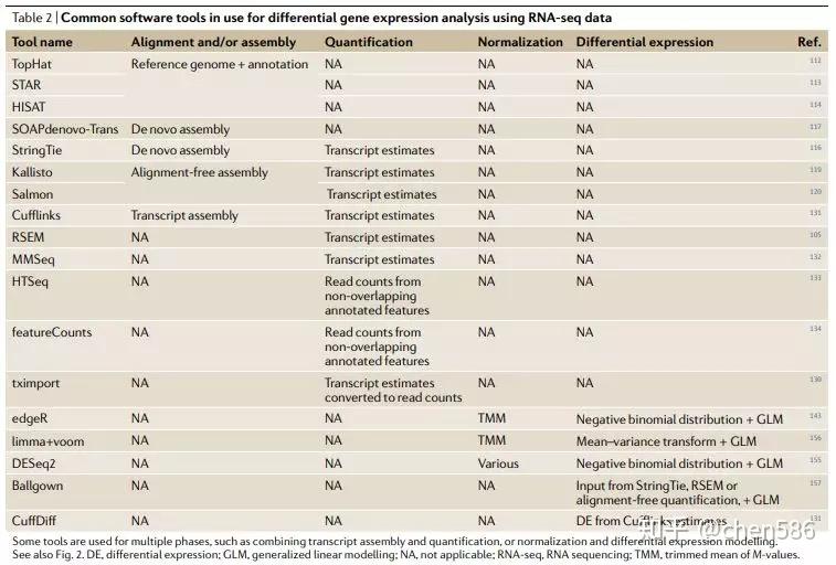 在过去的十年中,用于分析RNA-seq以确定差异表达的计算方法的数量已成倍增加,即使对于简单的RNA-seq DGE,在每个阶段的分析实践中也存在很大差异。而且,每个阶段使用的方法的差异以及不同技术组合形成的分析流程都可能会对从数据得出的生物学结论产生重大影响。最优工具组合取决于研究的特定生物学问题以及可用的计算资源。尽管有多种衡量方式,但我们对工具和技术的评估落脚点在它们鉴定出的差异基因的准确性。为了完成这个评估,至少需要四个不同的分析阶段(图2;表2)。第一阶段把测序平台生成的原始测序数据比对到转录组。第二阶段量化与每个基因或转录本来源的reads数量,构建表达矩阵。该过程可能包括1个或多个子过程如比对,组装和定量,或者它也可以一个从读取计数生成表达矩阵。通常有一个第三阶段,包括过滤低表达的基因和至关重要的移除样品间技术差异的标准化过程。DGE的最后阶段是构建样本分组和其它协变量的统计模型,计算差异表达置信度。