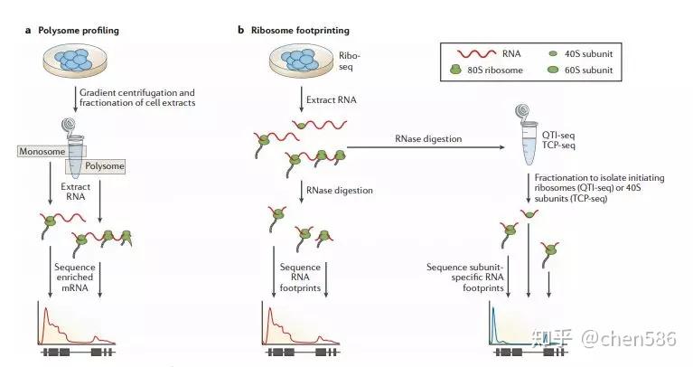 Polysome profiling多核糖体分析使用蔗糖梯度超速离心法将多个核糖体结合的mRNA (polysomal fraction)与单个或无核糖体结合的mRNA (monosomal fraction)分离分别用于RNA-seq文库制备(图5a)。在polysomal fraction比monosomal fraction中检测到更高丰度的mRNAs翻译活性更高。该方法不仅可以推断单个mRNA的翻译状态,还可以生成核糖体占有率和密度的高分辨率图谱(尽管它无法确定核糖体的位置)。后续也对原始方法进行了一些改进。例如,使用非线性蔗糖梯度改善了在不同浓度蔗糖溶液临界浓度处多聚核糖体mRNA的收集;应用Smart-seq文库制备方法可以检测低至10 ng的多聚核糖体mRNA;使用更高分辨率的蔗糖梯度和深度测序允许检测转录本异构体特异性翻译。然而,多核糖体谱分析只能产生相对低分辨率的翻译谱,并且是需要专门设备,限制了其广泛使用。