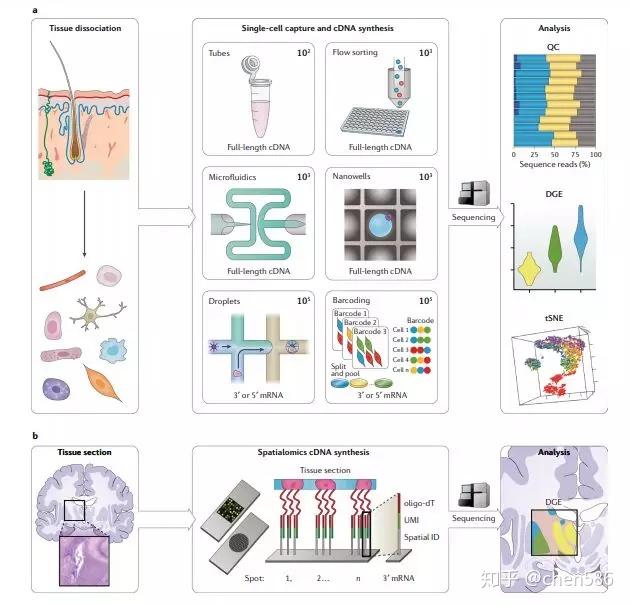 机械分解和collagenase及DNase的酶解在单细胞悬浮液中产生的活细胞比例最高,但是这一比例具有高度组织特异性,最好根据经验确定,并且要非常小心。一旦制备了单细胞悬液,就可以通过各种方法分离单个细胞(图3a);由于大多数实验室都可以使用流式细胞仪,因此最容易获得的方法是将细胞直接分选到含有裂解缓冲液的微量滴定板中。对于更高通量的实验,存在多种用于分离细胞的技术,但需要构建或购买特定的单细胞仪器。单个细胞可以在微流体芯片中进行物理捕获,或按照泊松分布模型加载到纳米孔设备中,也可以通过基于液滴的微流控技术(例如在Drop-Seq,InDrop中)分离单细胞并与后续反应试剂包裹在一个液滴中,或者采用原位序列条形码标记(例如单细胞组合索引RNA测序(sci-RNA-seq)和基于分池连接的转录组测序(split-pool ligation-based transcriptome sequencing, SPLiT-seq))。单细胞分离后会被裂解释放RNA到溶液中以进行cDNA合成,并用于RNA-seq文库制备。通常在文库制备过程中会使用PCR扩增单个细胞的RNA。这一步扩增会引入PCR偏差,需要使用UMI进行校正。尽管由于逆转录过程符合Poisson采样分布,但只有10–20%的转录本会被逆转录,限制了转录本检测的敏感性,不过各种方法都可以生成可用的数据。在湿实验室之外,计算方法也在迅速发展,并且最近出现了关于scRNA-seq实验的设计指南。方法学的飞速发展意味着scRNA-seq方法的技术会快速过时。尽管如此,Ziegenhain等人提供了scRNA-seq方法的综述,强调了UMI在数据分析中的重要性,并展示了所比较的的六种方法中哪一种最敏感。但是,他们的研究不包括被广泛采用的10X Genomics技术。