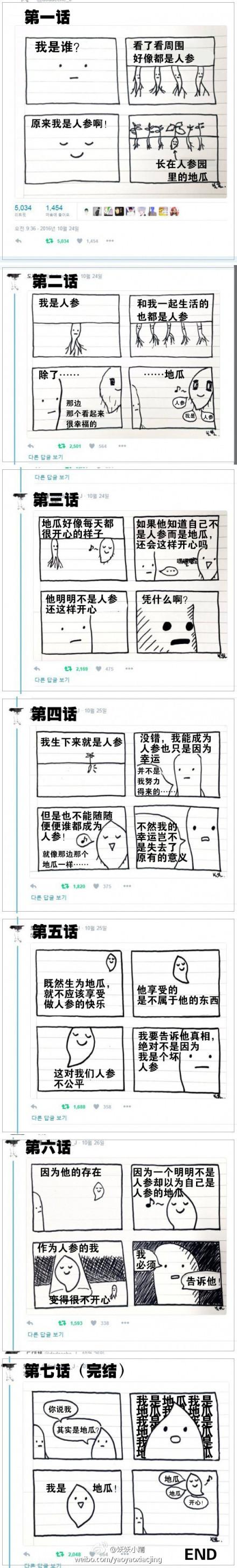 漫画极其直白,几乎看不出啥技巧,但能把人参和地瓜两个对立面的心态表达得淋漓尽致。