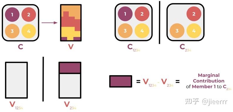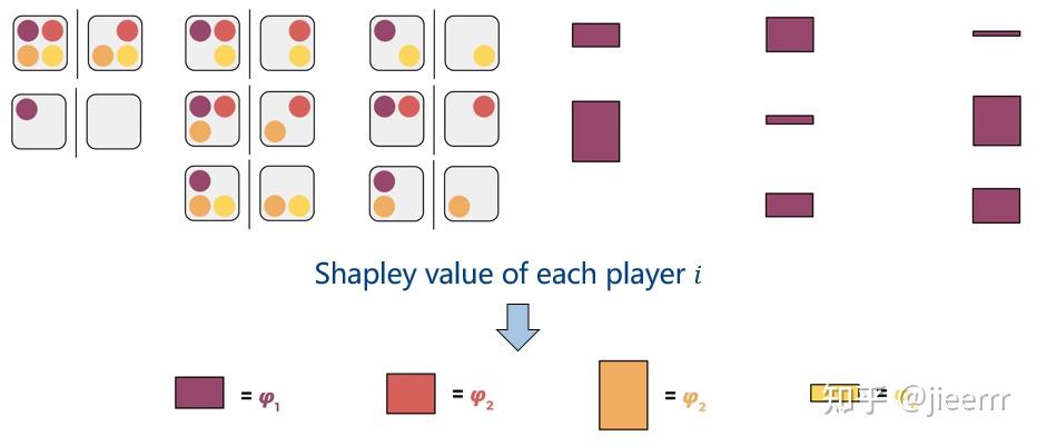如果我们累加成员1在所有联盟里的边际贡献,即考虑每一个联盟都剔除成员1后的价值变化,那么对于成员1的平均边际贡献就是 \varphi_{1} ,相应地,也能计算出其他成员的平均边际贡献 \varphi_{2} , \varphi_{3} 和 \varphi_{4} 。这些值就是Shapley值,代表着每个成员的贡献程度。