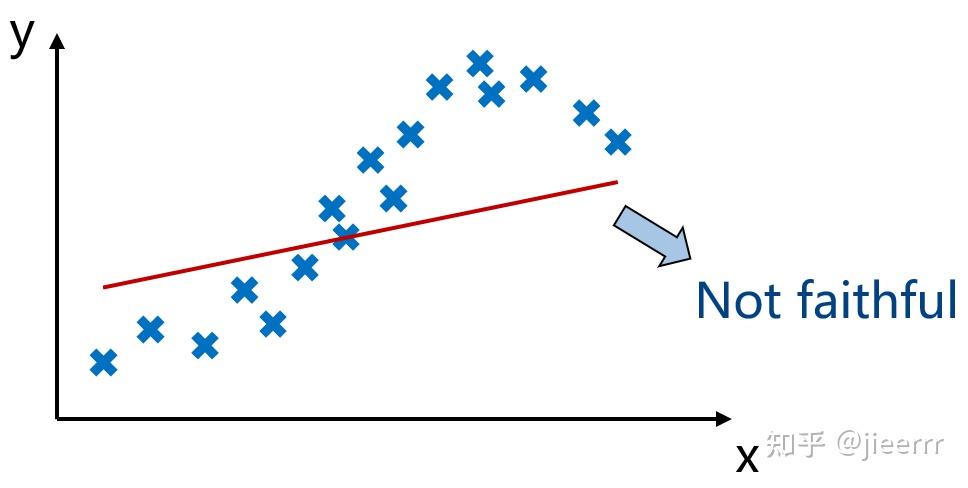 - 可信赖的(Faithful):解释器需要描述模型到底在做什么,比如说底下的叉是实际的数据分布,那么我用红线去拟合就是不可信赖的,因为它没有理解模型真正在做什么。