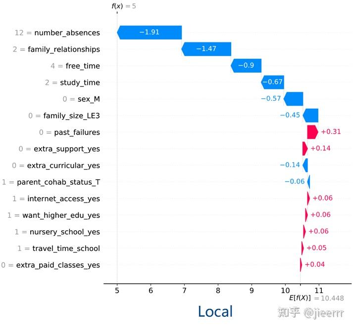 同样,我在预测学生成绩数据集上进行分析,下图是单个样本的解释,里面有两条线,E[f(x)]表示所有学生的平均成绩10.448分,f(x)表示需要被解释的学生的成绩5分。这个图的左边是学生的特征值,SHAP的解释和前面两种方法不一样,它从平均值出发,分析各个特征的影响程度。这些红色的箭头代表这些特征对该学生的成绩起到了加分的作用,而蓝色的箭头则起到了减分作用。比如放学后的休息时间(free_time)是4(5是满分,代表休息时间很长),这会导致成绩降低,家庭关系不和睦也会导致成绩降低,最重要的是旷课了12次,进一步降低了成绩。所以SHAP的解释图给人一种推动的感觉,就是部分因素积极地推动,部分因素消极地推动。