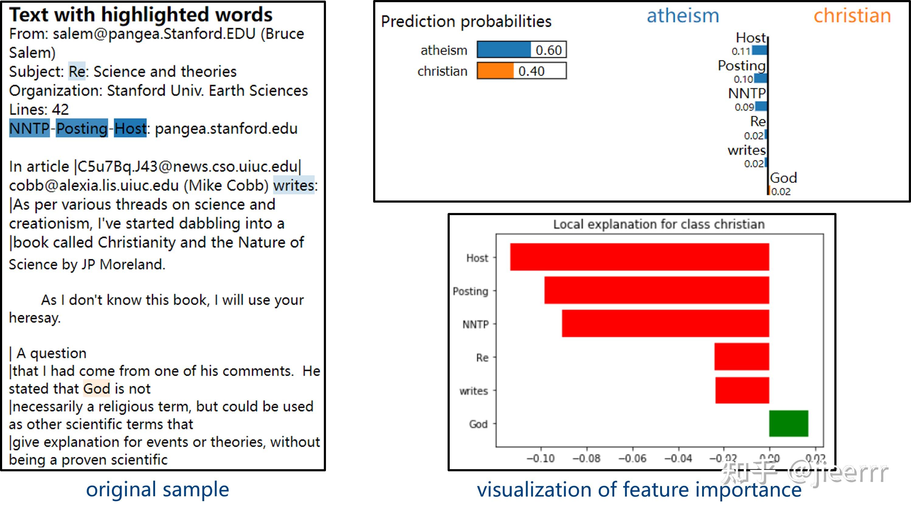 首先是文本分类,这是一个判断一段文本是无神论还是基督教的分类器,准确率能达到92.09%。这是需要被解释的样本,我们发现这段文本有60%的可能性是无神论,40%的可能性是基督教,然后我们用LIME来对它进行解释,发现这个分类器判断基督教是因为文本里出现god这个词,这是符合预期的。然而它判断无神论不是根据邮件的内容而是邮件的抬头,这里颜色越深表示这些词对它的判断结果越重要,这样的判断逻辑显然是不正确的。如果我们没有LIME,我们可能会被这个分类器的高准确率所欺骗,有了LIME,我们会发现这个分类器似乎真的跟神马汉斯一样,不知道在做什么。