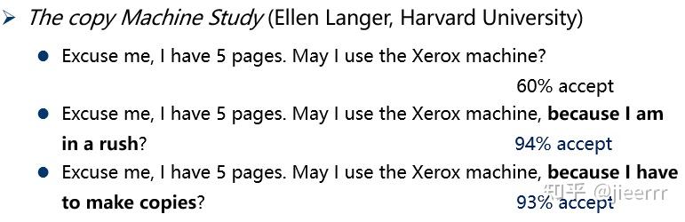 以下是一个跟机器学习完全无关的心理学实验,这个实验跟打印机有关。在哈佛大学的图书馆里,打印机前面会排很长的队,这个时候如果有一个人跟他前面的人说:“拜托,请让我先印,我就印5页而已。”结果是有百分之60的人会接受。如果我们把刚才的话稍微改一下,变成“能不能让我先印,因为我赶时间”。他是不是真的赶时间,没有人知道,但是当你有一个理由所以你要先印的时候,大家的接受程度变成了94%。更神奇的事情是,就算你的理由稍微改一下,比如有人说:“能让我先打印吗,因为我需要先印。”光是这个样子,大家的接受程度也有93%。
