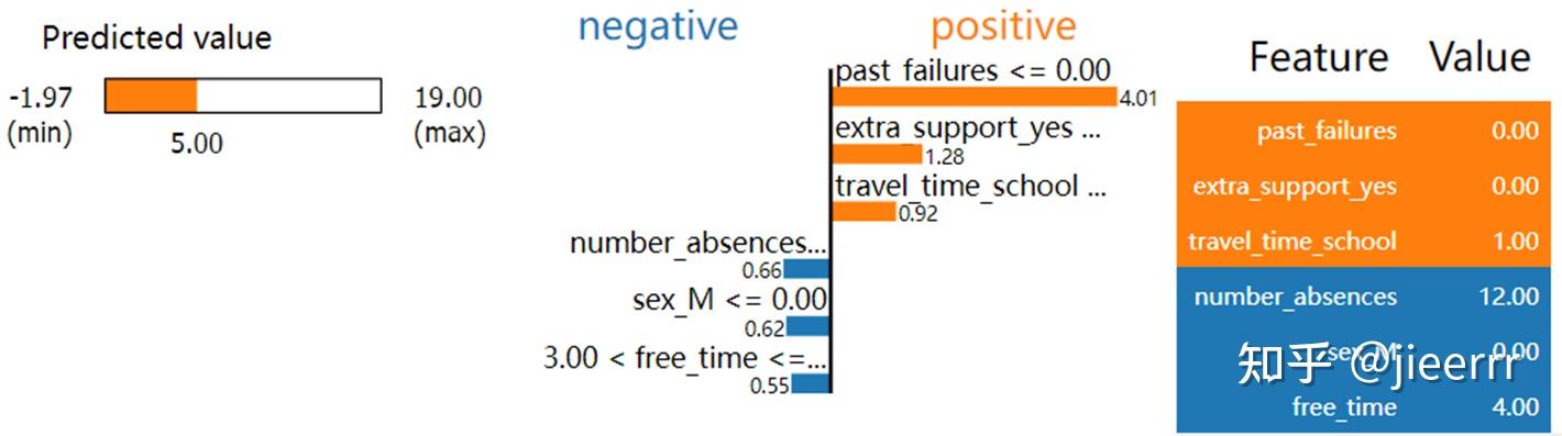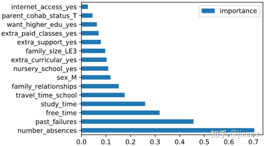 结果如上图所示,我们可以看到对学生成绩影响最大的特征是旷课的次数(number_absences),其次是过去课程不及格的次数(past_failures),再是放学后的休息时间(free_time)。这个结果确实也是比符合我的预期的,但这里有一个问题,即我们只知道这三个特征对成绩影响很大,但它具体是起到正反馈还是负反馈的作用,这张图并不能体现出来,因此置换特征重要性它不能展示特征值是如何影响最终结果的。
