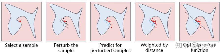 主要过程[14][15]:首先选择一个需要解释的样本x,然后对它进行扰动,就是找到它周围的样本,然后对这些样本进行预测,一些样本就变成蓝色的,一些样本就变成红色的,然后再根据这些样本与需要解释的样本的距离进行加权,最后其实就是用这些样本点去训练一个局部的线性模型。