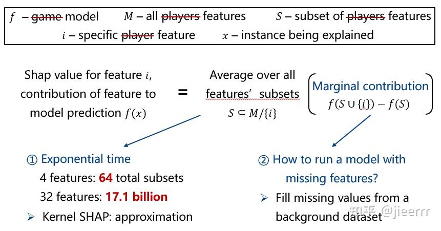 在博弈论中,我们度量的是每个player对结果的贡献度,而在机器学习中,我们要度量的是每个特征对结果的贡献度。我们把刚才公式里所有的player都改成feature,并把刚才的game改为model就可以了。但是这里会遇到两个挑战,第一个是特征联盟是呈指数增长的,刚才1个成员就涉及2的4次方,16个联盟,然后总共有4个成员,就是64个联盟,同样地,在这里4个特征我们需要计算64个联盟,而当特征增加到32个的时候,将要计算171亿个联盟,这显然会导致效率很低。这也是Shapley值的一个致命缺点,就是在99.9%的实际问题中,只有近似计算的方法才是可行的。第二个挑战是由于机器学习模型的输入在设计时就固定好维度了,如何将缺少特征值的输入丢到模型中运行?那这里采取的是填充的办法,可以根据经验填充,也可以随机填充,当然这也会导致不符合现实的数据产生。因此,SHAP的本质思想是把博弈论中的Shapley值迁移到机器学习领域,然后解决了两个挑战。