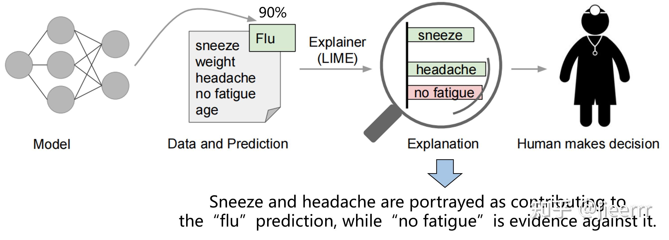 我们考虑一个辅助医生预测流感的机器学习模型(如下图),当我们把病人的数据输入到模型中,它会输出一个结果,它告诉医生这个病人得流感了,因为输出的概率是90%,医生可能并不会相信,因为模型只给了一个硬生生的数字,但如果这个模型给出判断理由,即这个病人打喷嚏和头疼的症状促使模型把他预测成得流感,那医生可能会选择相信这个模型,因为模型的判断是有理有据的,并且符合他的经验。因此可解释性能够提升我们对机器学习模型的理解能力和接受程度。然而不幸的是,尽管现在大多数深度神经网络在各类竞赛上刷新准确率,它对于我们人类来说仍然是一个黑盒子,这在一定程度上也限制了它在实际中的应用。