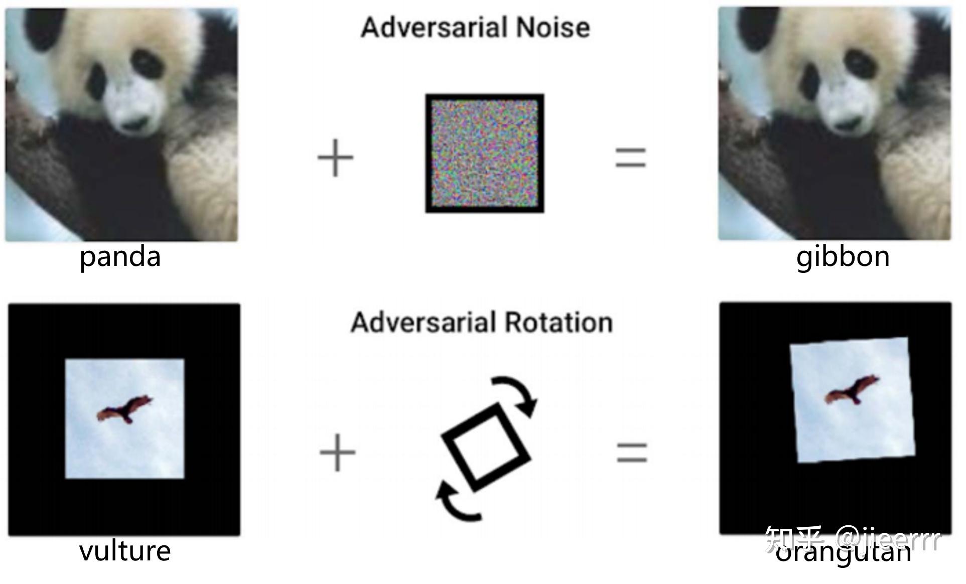 破坏机器学习模型的鲁棒性,最典型的例子就是对抗攻击,我们可以通过向图片里添加一个很小的噪声,就能使模型把大熊猫认成长臂猿。此外,把图片进行一个细微的转动,模型就能把秃鹰认成猩猩。因此尽管深度神经网络在众多领域获得了前所未有的成就,它依然很容易被欺骗,并且这样的欺骗在我们看来是不可思议的。