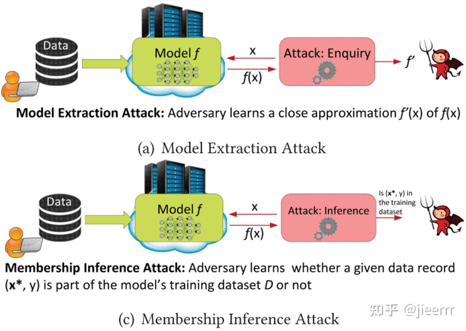 机器学习的隐私问题是被广泛关注和研究的,并且已经有相应的法律规定,比如中华人民共和国网络安全法第42条规定“网络运营者不得泄露、篡改、毁损其收集的个人信息;未经被收集者同意,不得向他人提供个人信息”。现在有用安全多方计算来保护数据隐私,联邦学习的提出的初心之一也是保护数据隐私。尽管有各种保护方法提出,攻击手段也同样更加先进了。比如联邦学习刚提出没多久,17年的SP[3](安全领域的四大顶会之一)就在该场景下,通过只获取用户上传给服务端的参数就推理出某条数据是否属于某用户的数据集,这种攻击手段叫作成员推理攻击。其次还有模型提取攻击,即敌手可以推理出整个模型的架构。因此机器学习模型仍然很容易泄露自己的架构和训练数据,从而泄露用户隐私,导致用户不敢信任模型。下图[4]展示的是模型提取攻击和成员推理攻击。