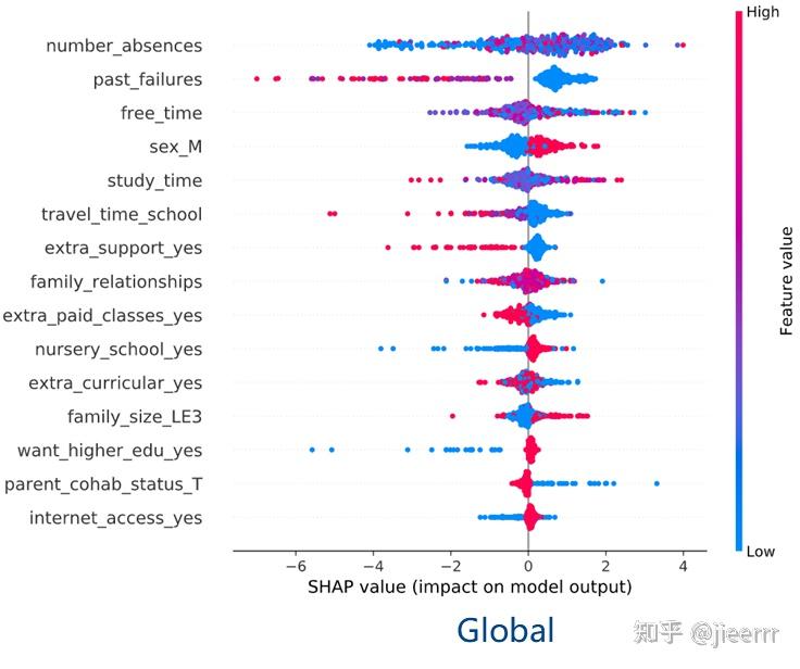 底下这张图也很有意思,是SHAP特有的。这张图是这样看的,从蓝到红表示特征值从低到高,比如蓝表示旷课0次,红表示旷课10几次。横坐标表示SHAP值,负的就是起到降低成绩的作用,正的就是起到提升成绩的作用。然后每个特征里面都有小圆点,表示的是每一个样本,即每个学生。我举几个例子来解释一下,比如这个past_failures,表示过去课程不及格的次数,蓝色表示不及格次数很少,红色表示不及格次数很多,我们发现蓝色的点所对应的SHAP值全是正的,红色的全是负的,也就是说,旷课次数少能促进成绩的提高,旷课次数多则相反。这也是符合预期的。再比如want_higher_edu_yes,红色表示想要获得更高的教育,蓝色表示不想要,图意为你不想获得更高的教育会使成绩降低,而想要获得更高的教育会提升成绩,但影响没那么大,因为红点都在0附近。最后再讲一个,internet_access_yes,你能上网则对成绩有积极影响,而不能上网大概率会降低成绩,但也不一定,因为有几个蓝点对应的SHAP值是正的。这是SHAP的实验结果,它通常可以让我们更加全面地去解释和分析模型的决策。