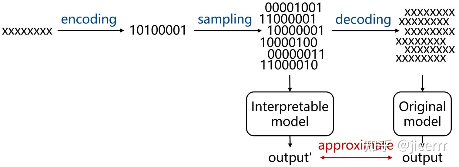 我再用一个图来展示一下整个过程,这里参考了《LIME:我可以解释任何一个分类模型的预测结果》[16](写得很好的一篇文章)。如下图,最左边一串是需要解释的原始样本,给它进行编码(比如是01串),然后再对这个01串进行扰动得到一堆新的样本,这些新的01串样本作为解释器的训练数据,会输出一个output',对这些新的01串样本进行解码,然后输入到原始模型中,也会得到一个output,然后就根据这两个output来构造损失函数并进行优化。这就是LIME的大致过程,其核心思想就是全局模型太难拟合了,我们就把目光聚焦在局部来进行模型的简化。