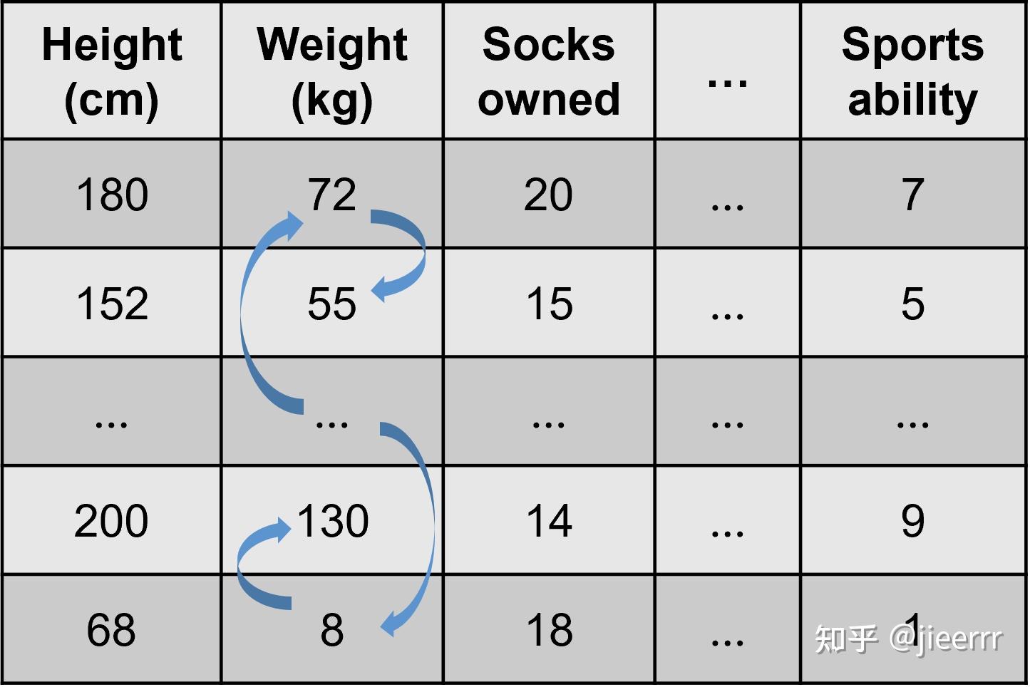 置换特征重要性是首先由这篇文章[9]提出的用在随机森林模型上,19年的这篇文章[10]把它变得一般化了,可以用在任何一个模型上。它的思想很简单,通过置换某个特征后,计算模型预测误差的变化程度来衡量该特征的重要性。举个例子,如下图所示,我用前面这些特征来预测一个人的运动能力,我们改变体重的数据,比如随机交换里面的数据,然后发现模型的预测误差明显增加了,那这说明体重这个特征很重要。相反,如果模型的预测误差几乎没有变化,那说明体重这个特征不重要。