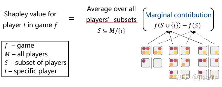 下面我介绍最后一种可解释性方法SHAP,这篇文章发表在17年人工智能的顶会NIPS上。SHAP是基于博弈论里的一个概念Shapley值[21]。这个Shapley值要解决的问题就是我们有一个联盟C,合作去创造了价值V,我们该如何度量每一个成员的贡献。通俗一点讲,就是我们几个人组队去参加比赛,最后得到1万元奖金,我们该怎么衡量每个人在这次比赛中的贡献来瓜分这1万元。比如说我们想度量成员1的贡献度,那我们就先把它从联盟中剔除,看看最终价值的变化,我们发现这块紫色的部分就是成员1对于234联盟的边际贡献。