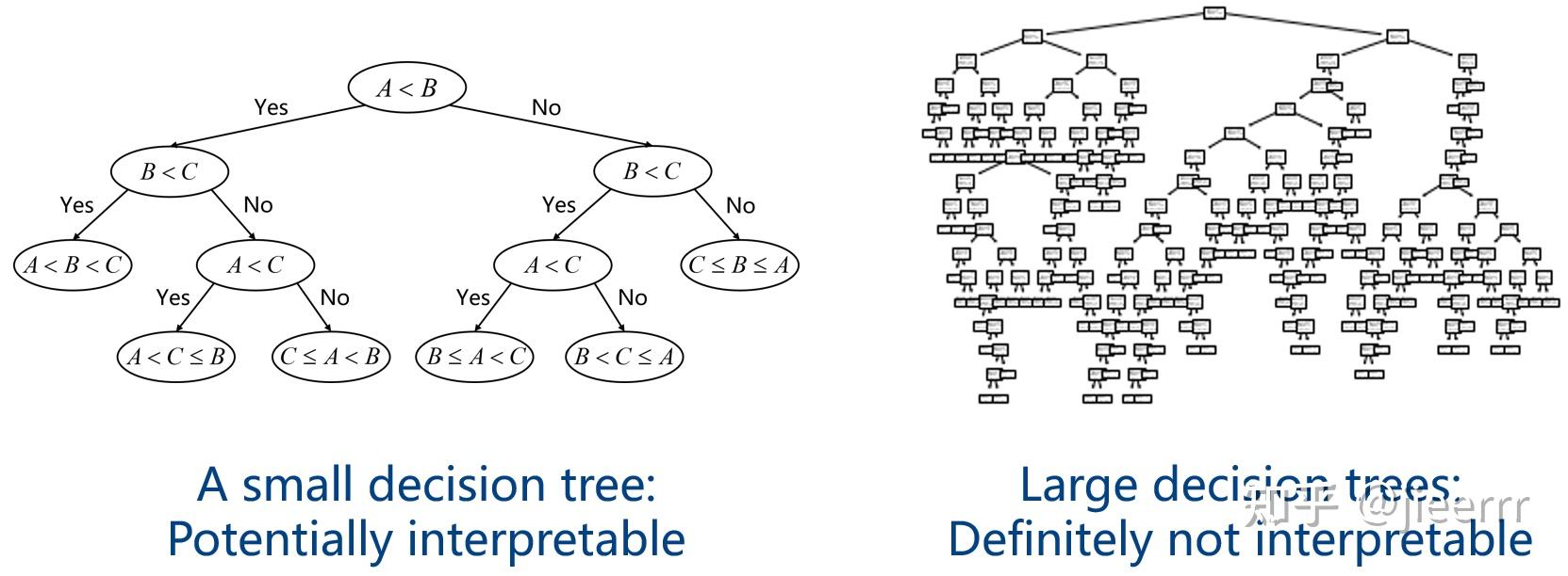 - 可解释性(Interpretable):它要求我们所使用的可解释模型是人类易于理解的,比如一颗小的决策树是很好理解的,一个不懂机器学习的人也知道这颗树在做什么,但这个模型它的准确率是不够高的,那我们要提升准确率,通常我们会采用一片决策树,这个时候,模型就变得不可解释了。我们可以看到作者这里对可解释的想法跟我前面所说的让人感到舒服是一致的,都是以人为核心。